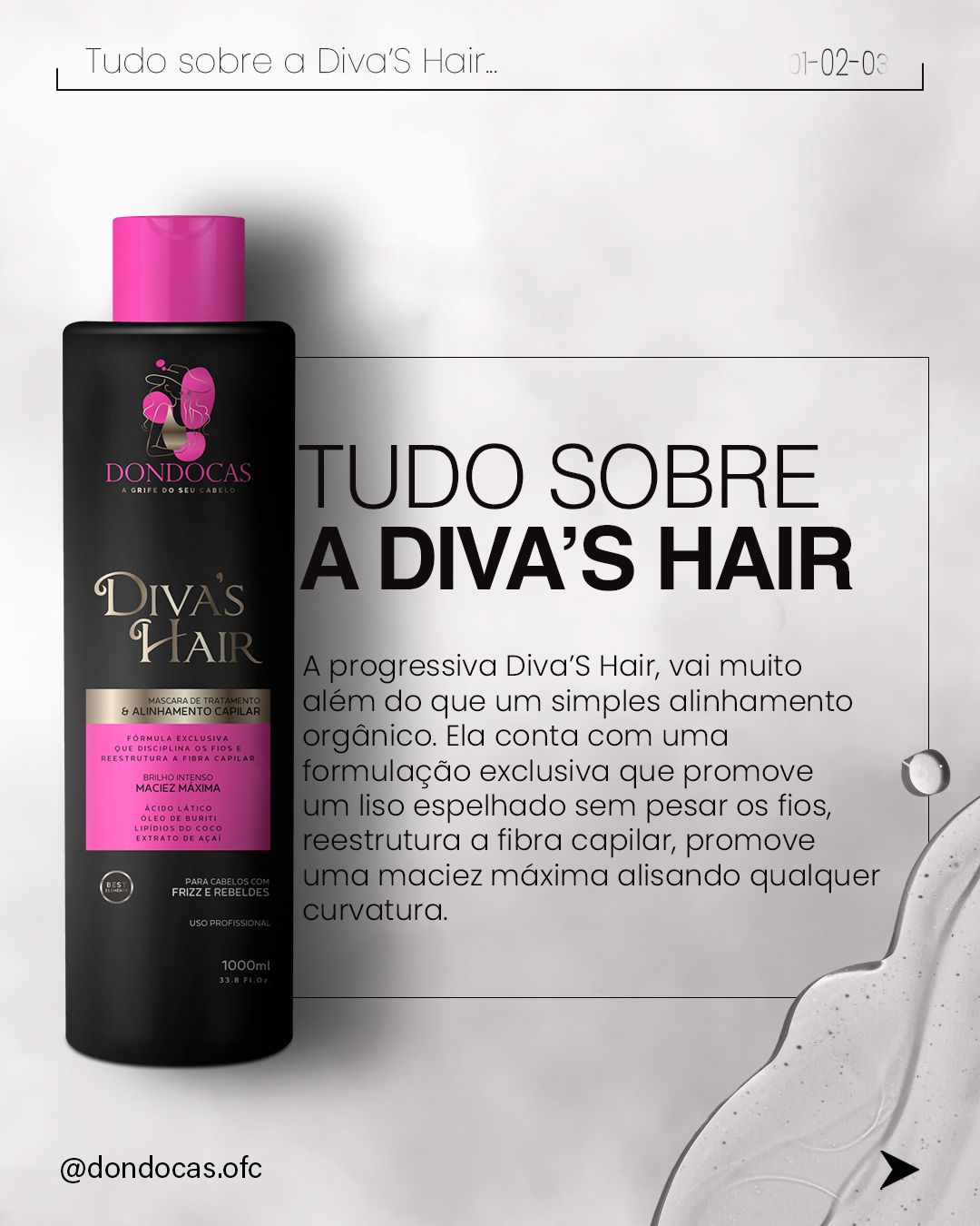 Ela conta com uma formulação exclusiva que promove um liso espelhado sem pesar os fios, reestrutura a fibra capilar, promove uma maciez máxima alisando qualquer curvatura.